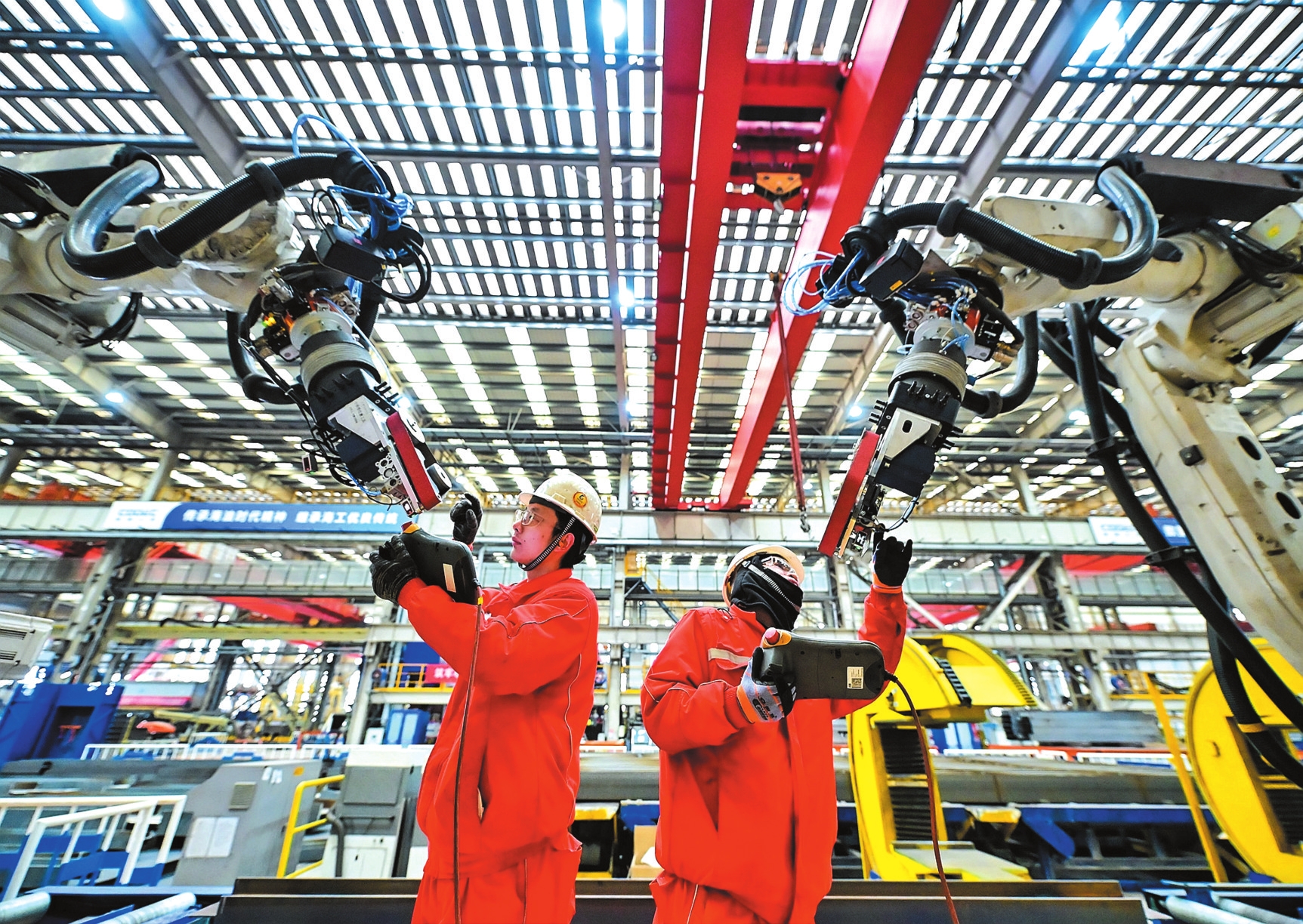 1月29日,在天津市滨海新区,海上油气平台建设工人操作打磨机器人。临近月末,各地企业铆足干劲赶订单、忙生产,力争新年首月“开门红”。新华社发(杜鹏辉摄)