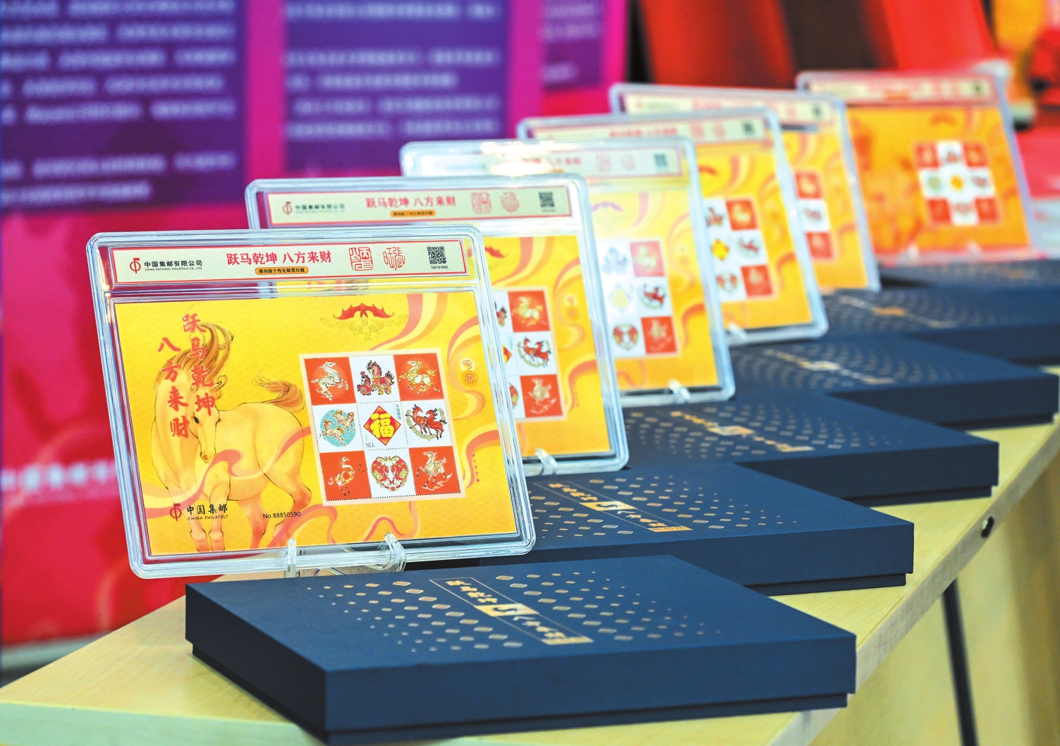 这是活动现场摆放的《跃马乾坤八方来财》雕刻版生肖主题邮票珍藏摆件(1月29日摄)。
