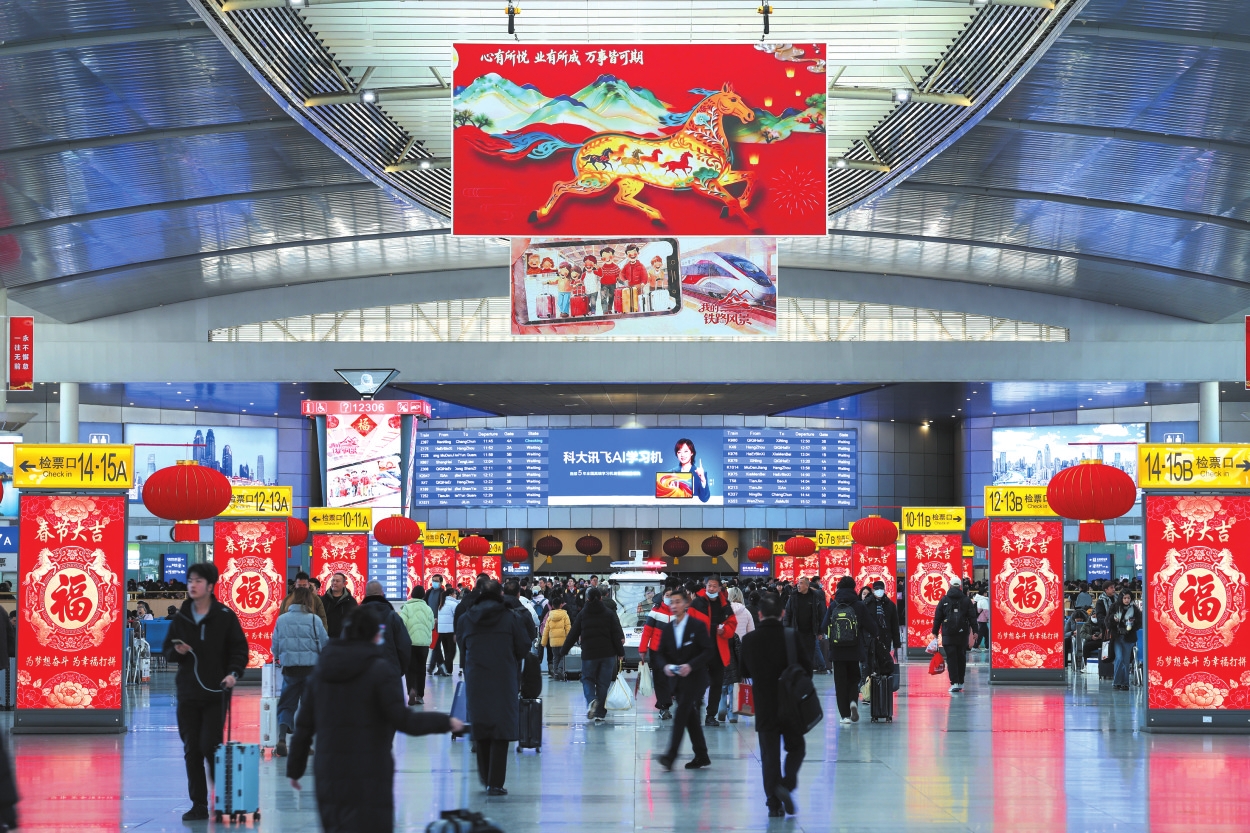 2月2日,乘客在合肥南站观看机器人拜年表演。新华社记者杜宇摄