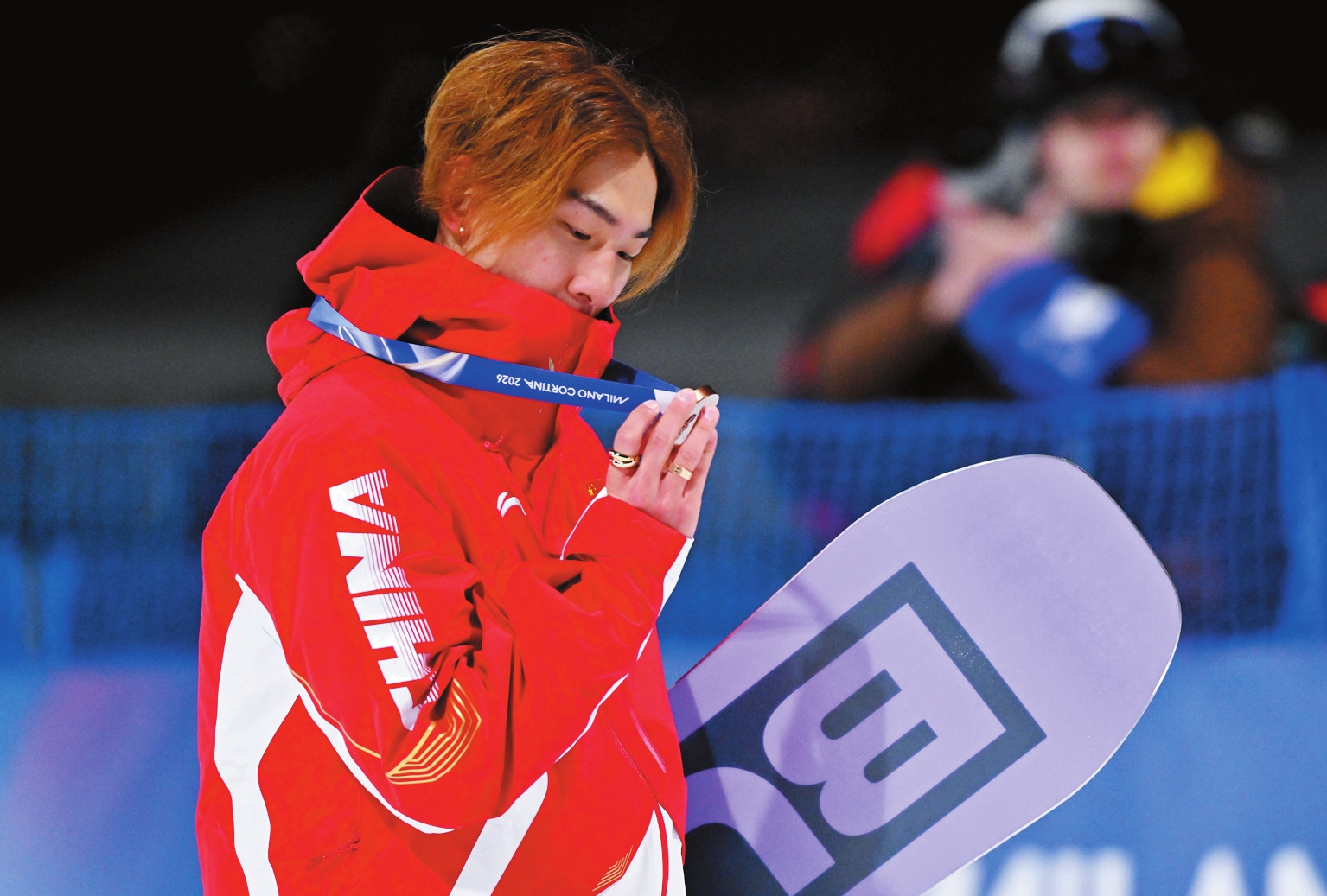 2月7日,在意大利利维尼奥举行的米兰——科尔蒂纳冬奥会单板滑雪项目男子大跳台决赛中,中国选手苏翊鸣获得铜牌。图为季军中国选手苏翊鸣在颁奖仪式后查看奖牌。新华社记者张宏祥摄