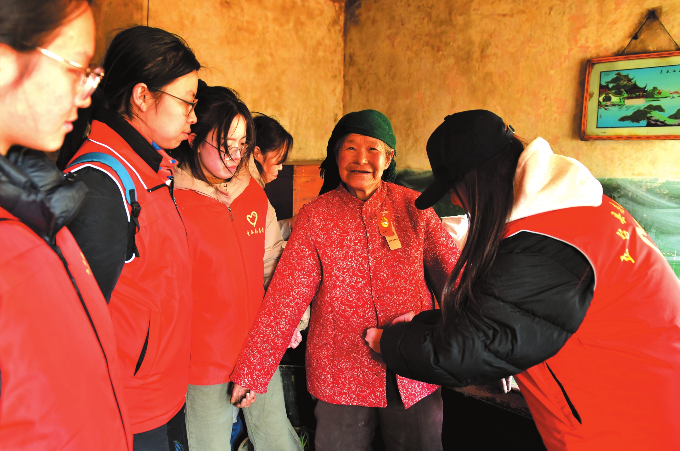 近日,五台县志愿者协会协同工业园社区志愿者和大学生志愿者,带着精心准备的年货,走进沟南乡翟子沟村、东雷乡东山底村、陈家庄乡王城村等地,看望慰问十二户孤寡老人和困难家庭,向他们送上社会各界的关怀和新春的温暖祝福。图为志愿者为腿脚不便的高龄老人试穿新衣服。卢俊华 摄