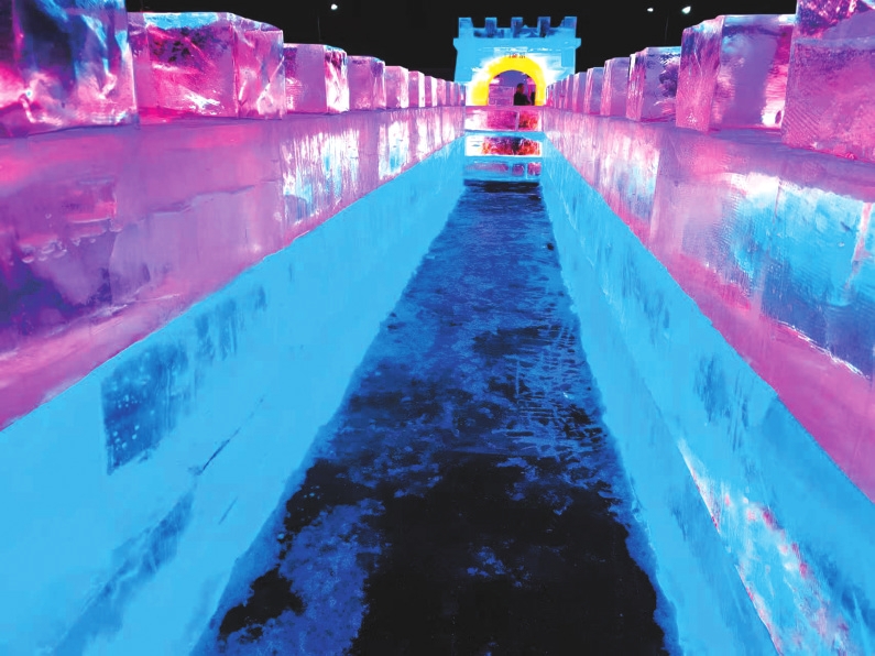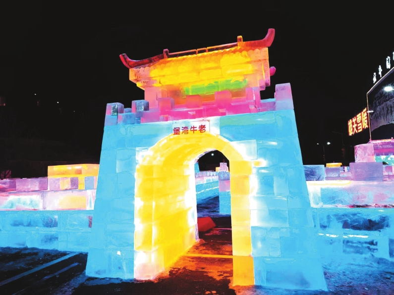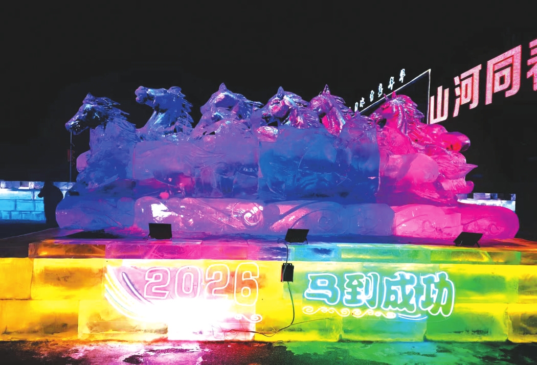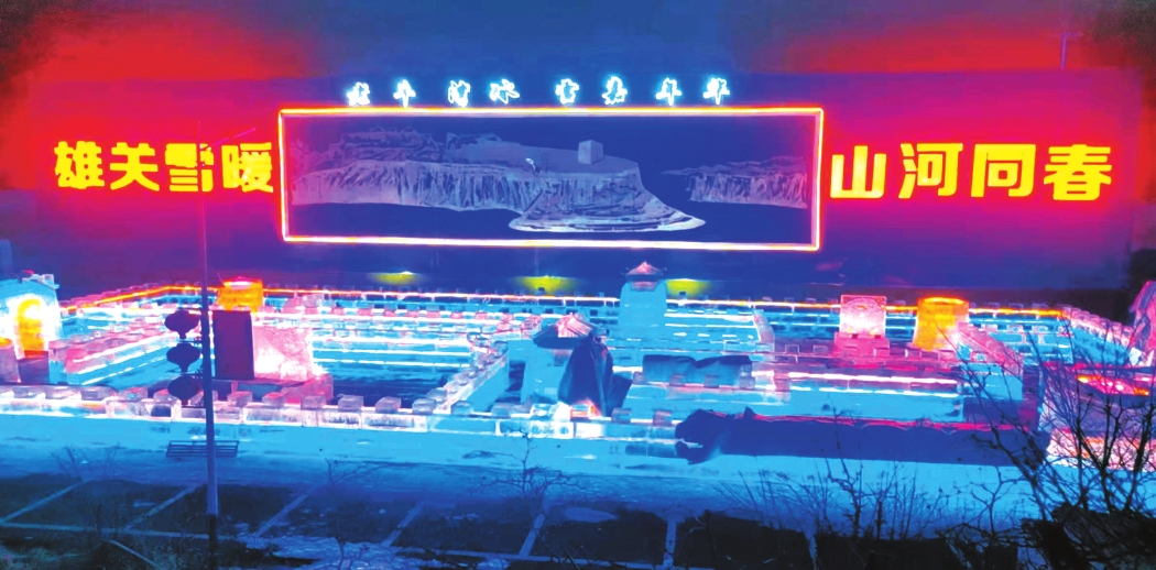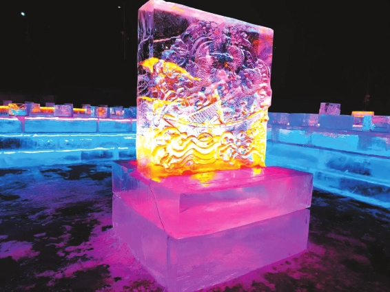 赏冰雕艺术。码头区域的冰雕展,将黄河、长城文化与冰雪艺术巧妙结合,晶莹剔透中尽显雄关气韵。