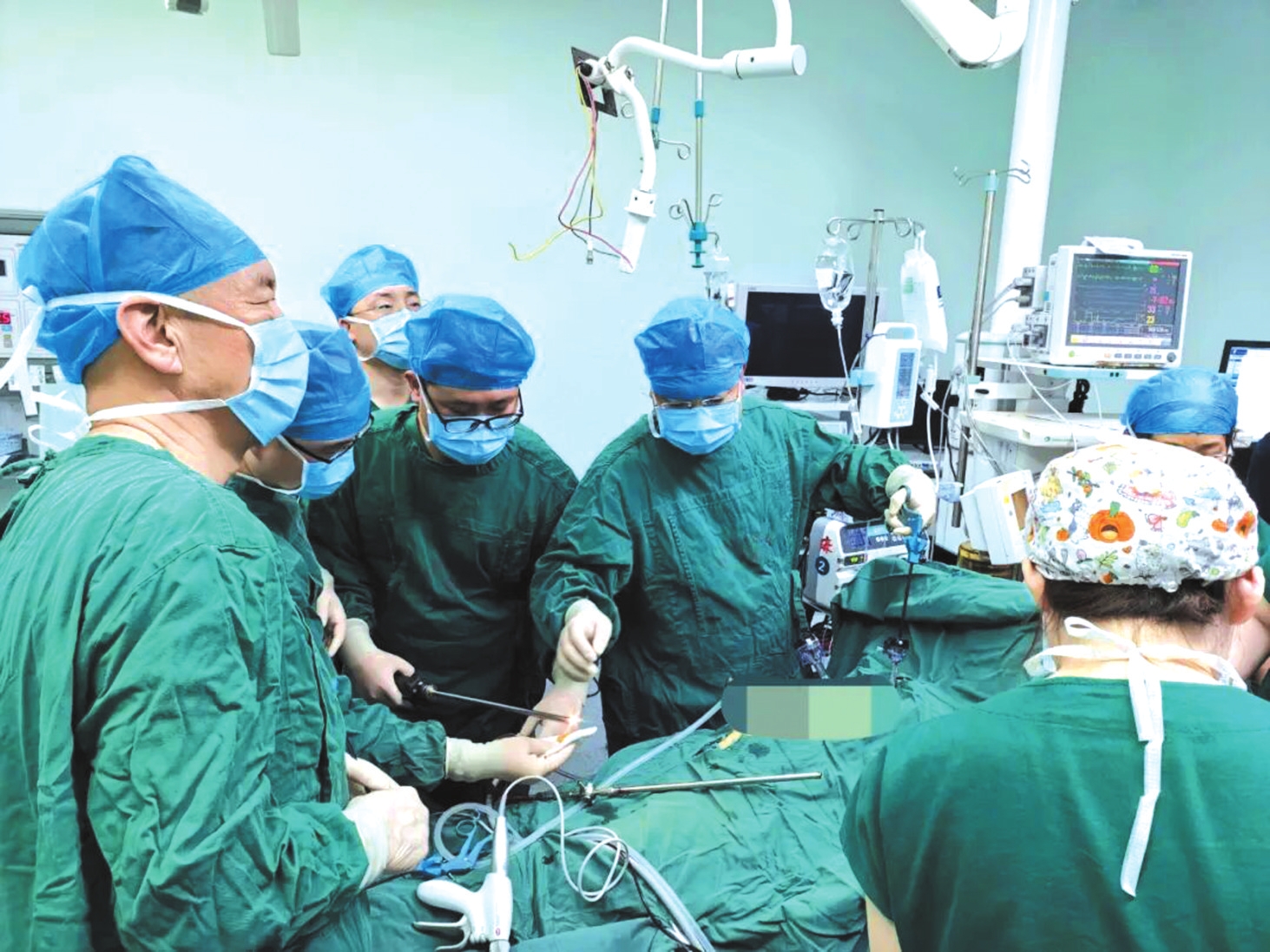 仅半小时,全部术前准备就绪,普外科李瑞环主任、普外二病区娄月红主任上台,实施腔镜探查。术中证实,患者脾脏被膜破裂,腹腔内积血量达1500—2000毫升,出血迅猛、病情万分危急。两位主任临危不乱、果断处置,凭借丰富临床经验与娴熟操作技能,沉着应战、精准施治,快速钳扎止血、有效控制出血,历时一个半小时顺利完成脾切除术。从决策手术到手术结束,全程仅约2小时,以“快、准、稳”跑出生命救治“加速度”。目前,患者病情稳定、恢复良好。