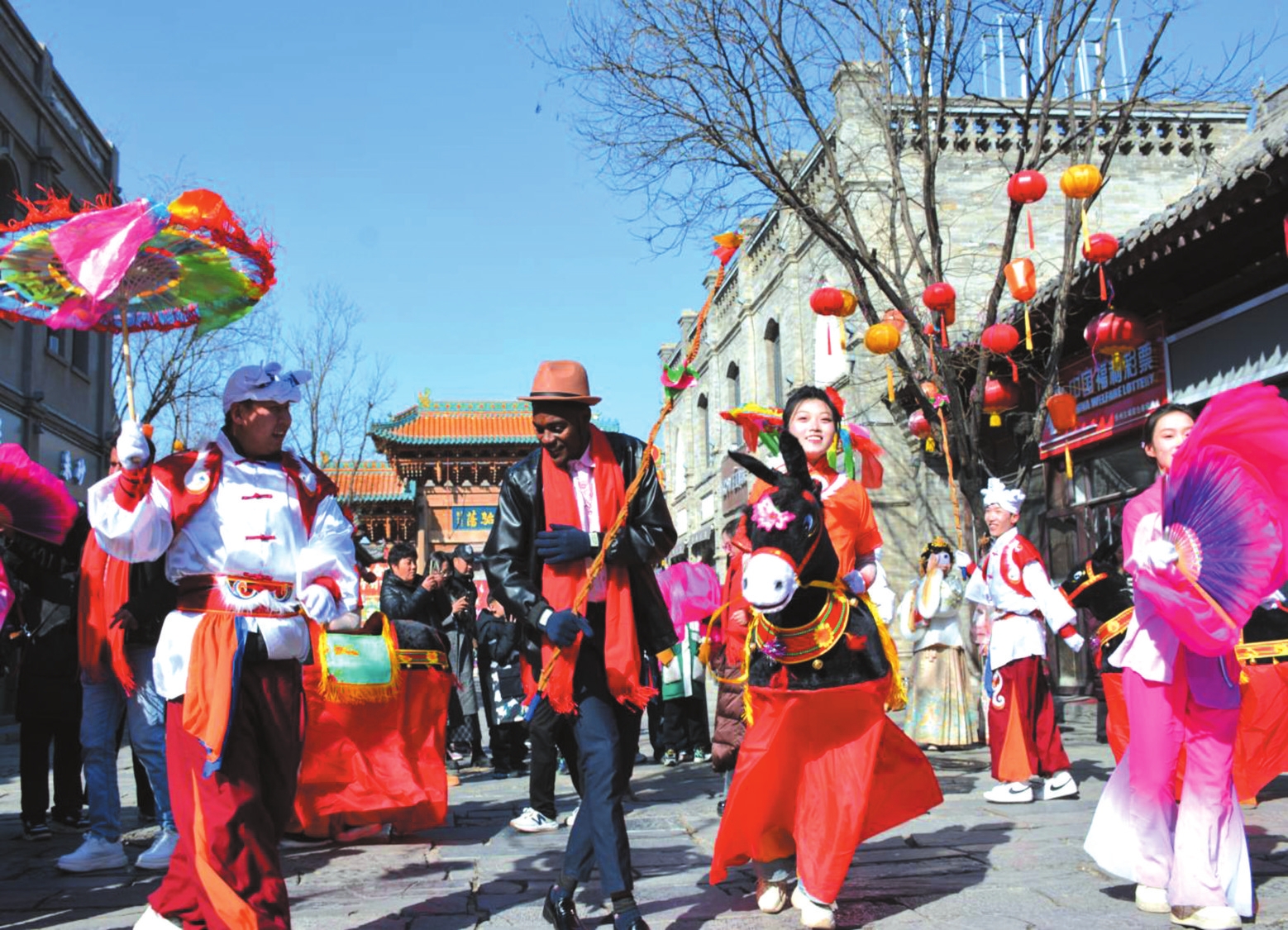 古城内红灯笼高悬、年味醇厚。留学生们沿南北大街走进忻州古城,感受古城千年底蕴与新春喜庆氛围。大家积极参与剪窗花、写春联、包饺子等民俗文化活动,场面热闹非凡。在剪窗花环节,手工剪纸非遗传承人亲自指导,留学生们手持剪刀,专注裁剪“马到成功”等贴合马年生肖的吉祥纹样,切身感受中华传统文化内涵与团圆之意。在“跑驴”特色民俗表演场地,留学生们随表演者参与其中,手持绸扇,跟随着音乐和鼓点尽情舞动,共同在欢快氛围中体会忻州民俗的生动魅力,深化对地方文化的认知。
