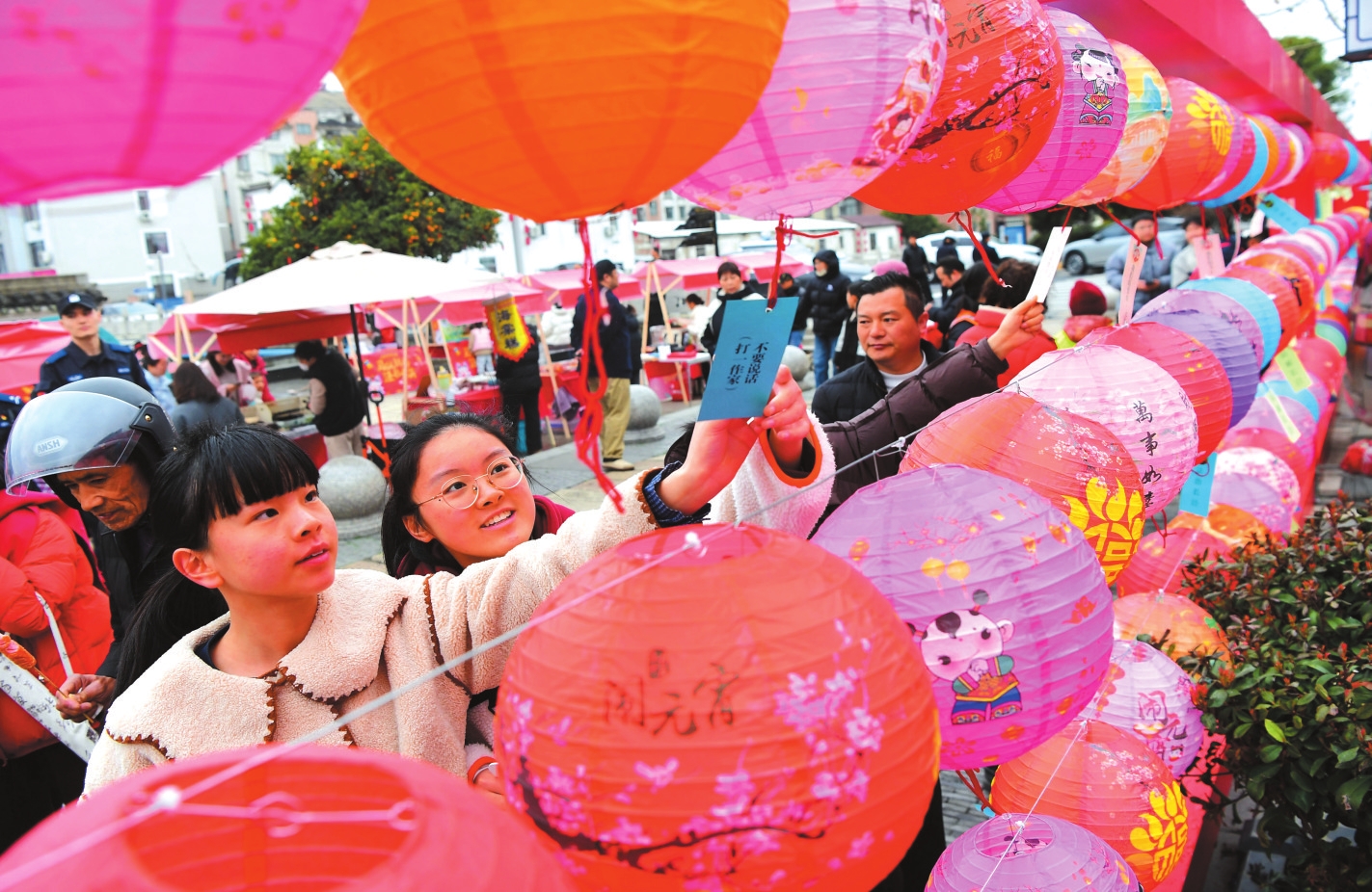 3月2日,人们在江苏省江阴市长泾镇举办的迎元宵活动上猜灯谜。