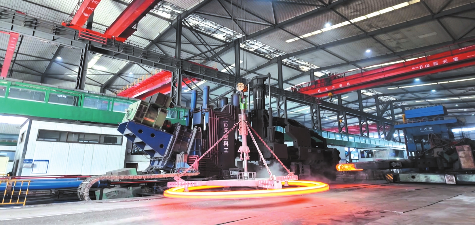 在山西天宝科工股份有限公司,下料、锻造、机加工等车间机器设备高效运转,工人们在各自岗位上忙着赶制海内外风电法兰订单。