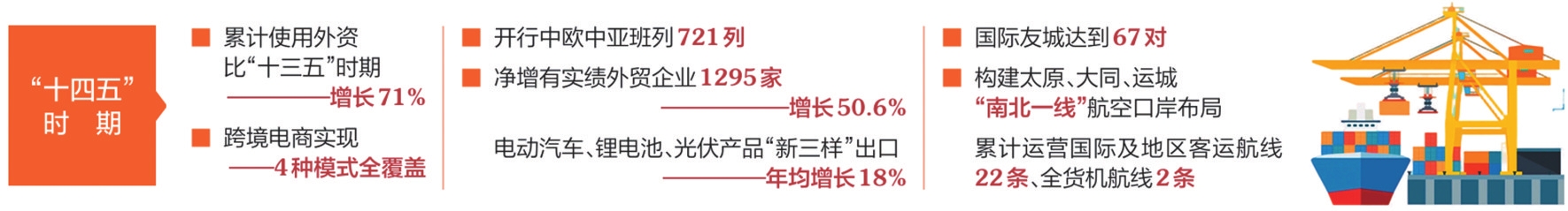 “十四五”时期,山西对外开放的步伐坚实有力。建立对外开放“1+N”政策体系,全省累计使用外资比“十三五”时期增长71%。服务贸易进出口额累计达107.9亿美元。外贸朋友圈拓展至158个国家和地区。外贸结构进一步优化,全省净增有实绩外贸企业1295家、增长50.6%,电动汽车、锂电池、光伏产品“新三样”出口年均增长18%。跨境电商实现4种模式全覆盖。中欧中亚班列汽笛长鸣,过去五年,开行中欧中亚班列721列,一条条钢铁巨龙驮着山西的玻璃器皿、大型机械,通达亚欧17个国家、48个城市,让“山西制造”与全球市场实现双向奔赴。太重集团生产的轮轴产品,凭借过硬质量,已远销全球60余个国家和地区;山西建投的业务版图,同样延伸至全球60多个国家和地区。农产品出口取得新突破,运城多款果品“首发”多国,大同黄花远渡重洋,藜麦粉首次摆上法国消费者的餐桌。