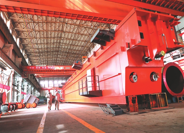 图为太重集团起重机分公司车间,即将发往印度AMNS公司的450t铸造起重机正在进行拆车包装作业。