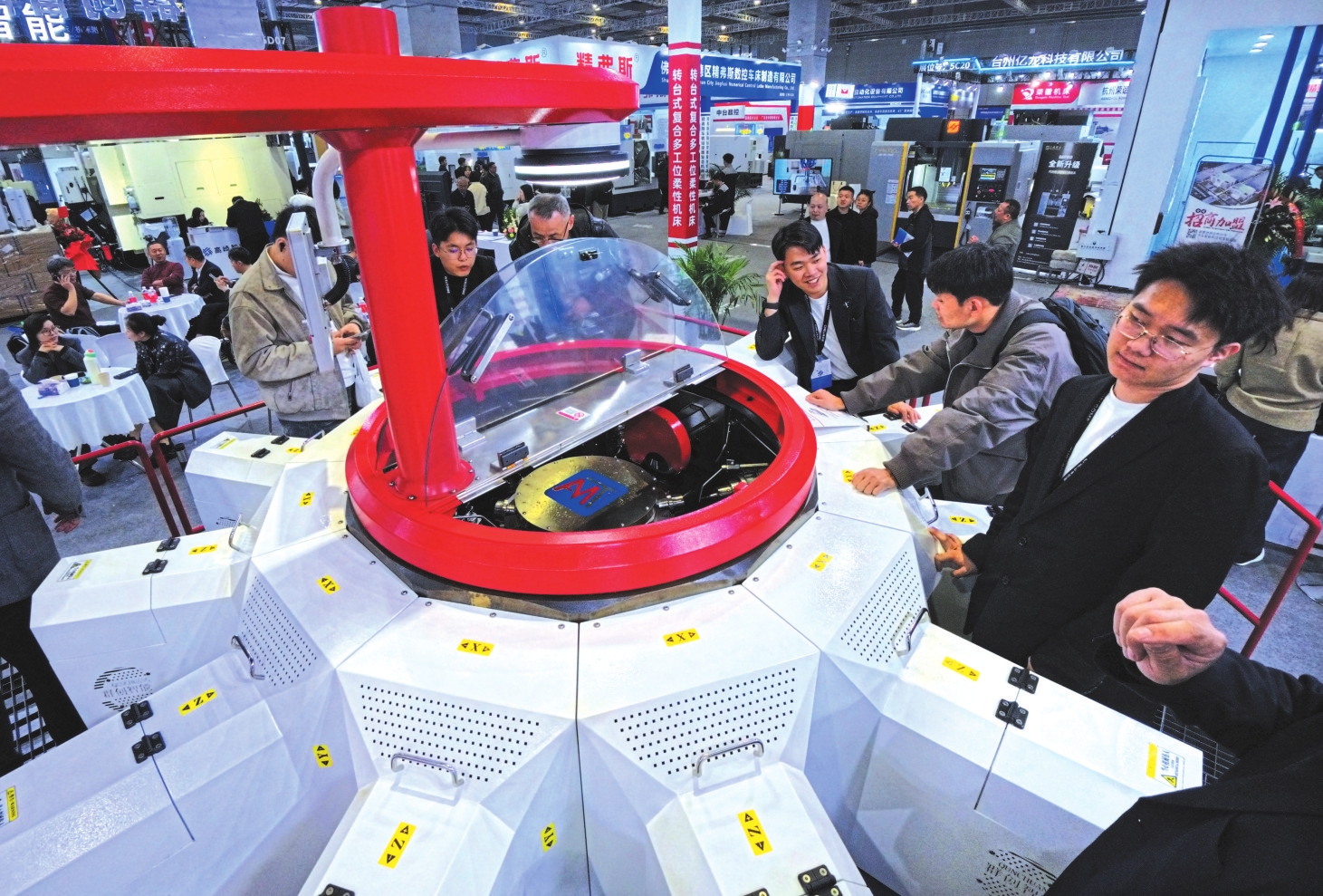 3月23日,参观者在一款转台式多工位柔性复合机床展品旁观看交流。