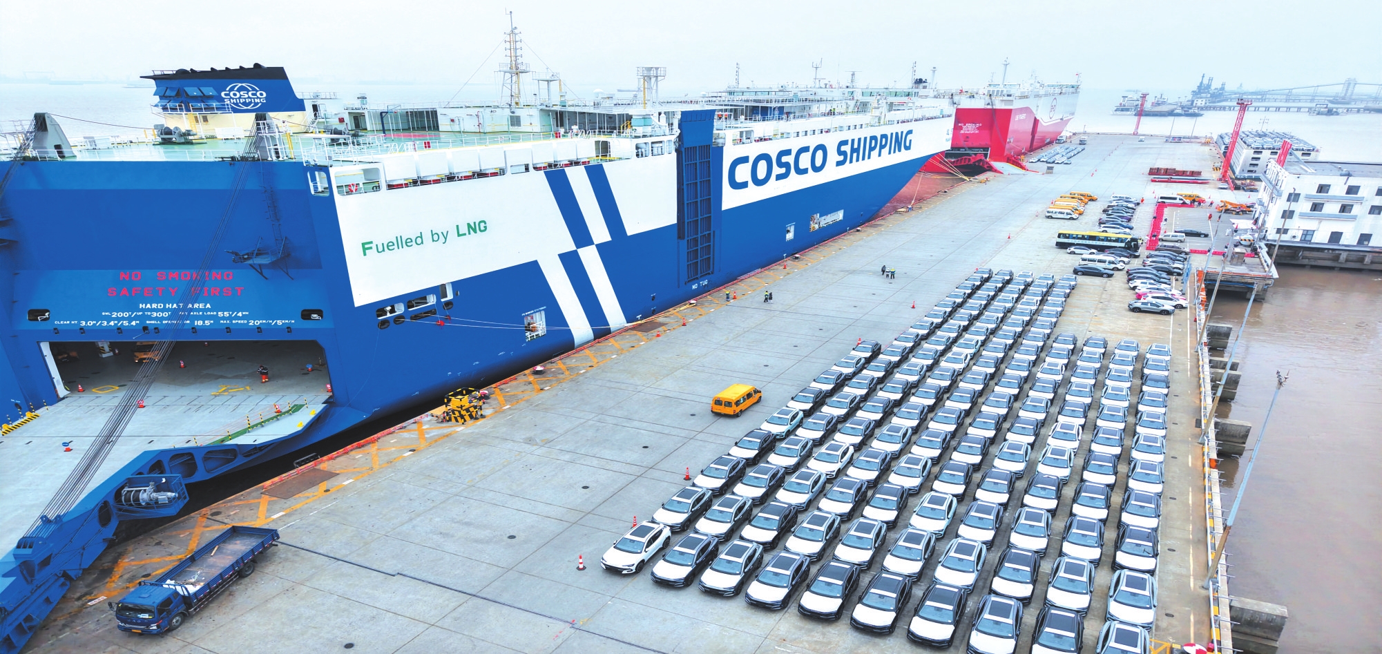 在上海外高桥的海通汽车滚装码头上,一辆辆崭新的国产汽车源源不断地驶入停靠在码头上的汽车滚装船。“十四五”期间,海通码头从外高桥“一港”,拓展到了位于上海临港的南港码头与位于江苏的太仓码头,形成了“两港三地”的协同格局。该码头现已开通12条国际汽车滚装航线,航线网络覆盖全球135个国家和地区的295个港口。2026年1至2月,海通公司“两港三地”合计完成吞吐量77.02万辆,同比增长27.71%。