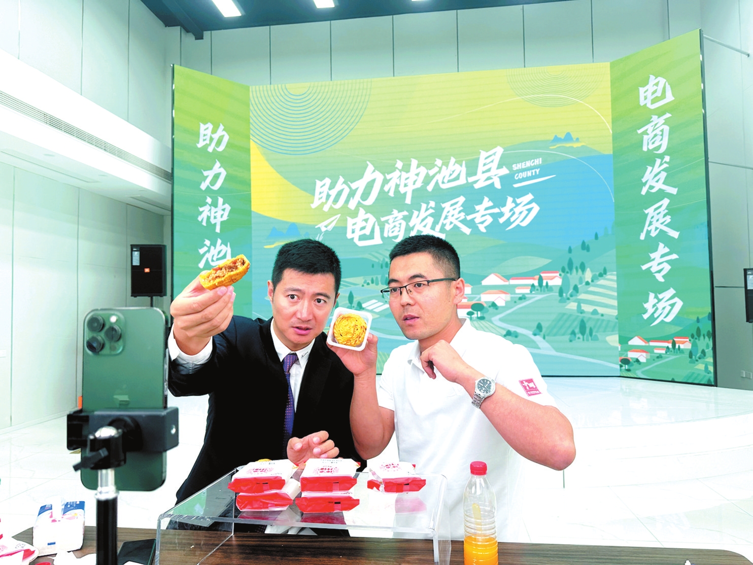 段笏咀村党支部书记、村委会主任高永胜(右)与网红王宝(左)直播销售“炉鏊月饼”。