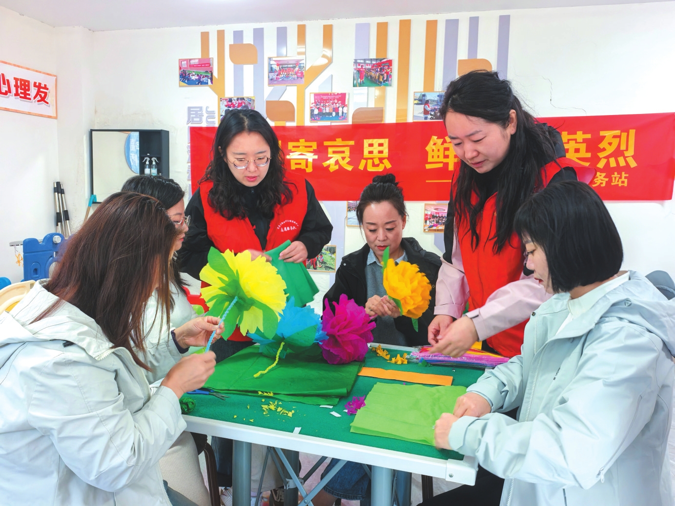 清明寄哀思,文明树新风。定襄县南城社区组织工作人员与社区居民手工制作祭祀花,并免费向社区居民发放,引导大家摒弃烧纸陋习,以环保、温情的方式追思先人。图为社区工作人员与居民一同制作手工祭祀花。 郭婧蕾摄