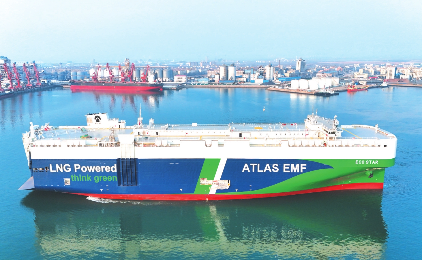 4月2日,7000车位双燃料汽车运输船“洁能之星”轮在山东港口烟台港龙口港区投入运营。该船配备液化天然气(LNG)动力系统,同时采用“氨预留”设计,可在升级改装后使用清洁的氨燃料。该运输船由中集来福士为希腊一航运公司建造,3月30日交付后抵达龙口港区。新华社发(唐克 摄)