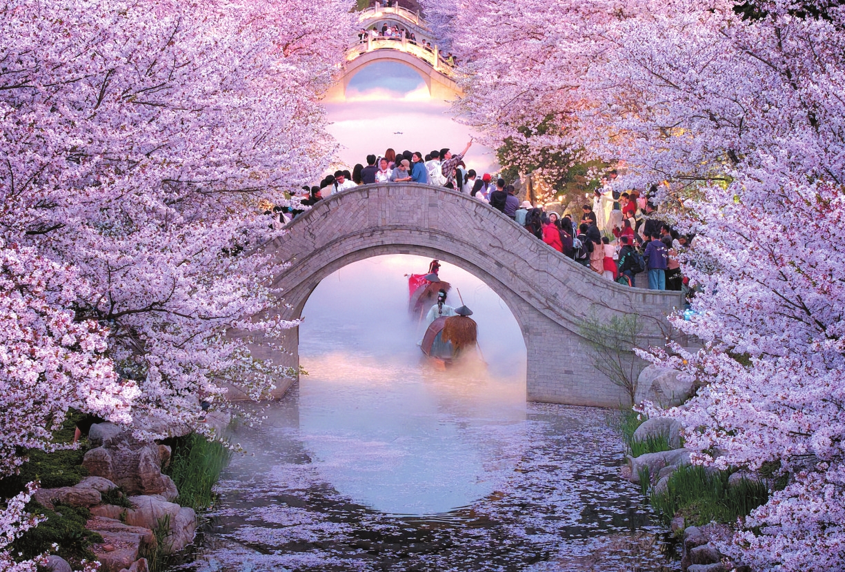 图③为4月5日,游客在江苏南通洲际梦幻岛欣赏樱花河。新华社发(许丛军 摄)
