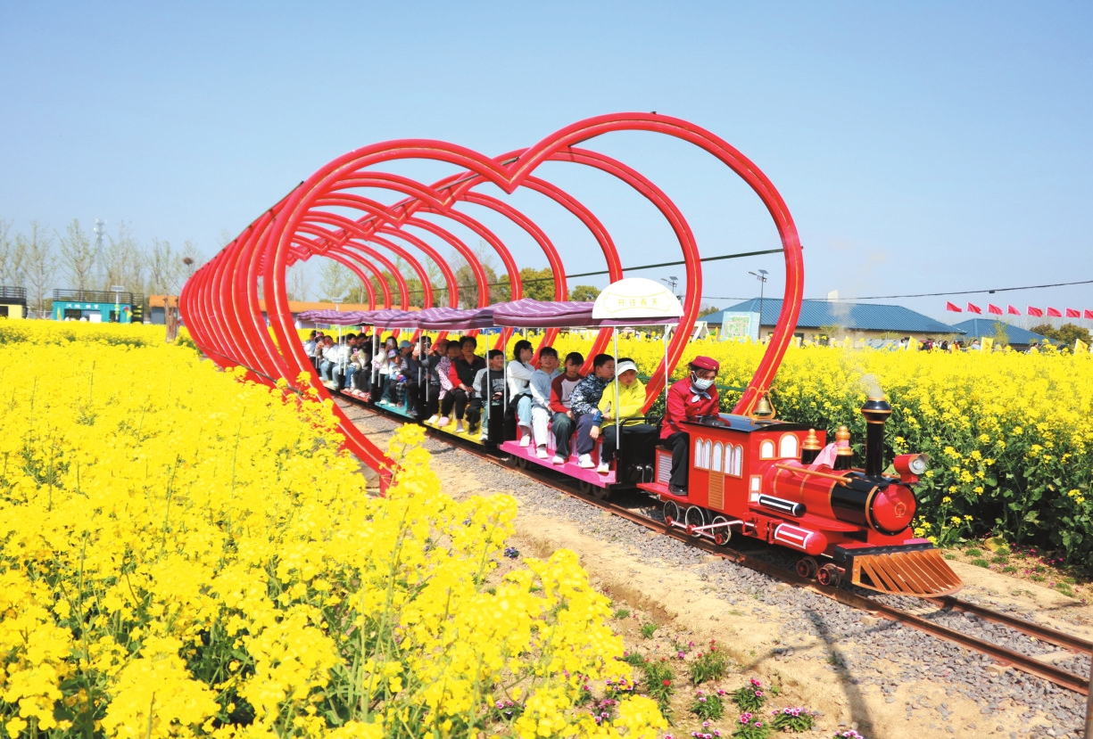 图②为4月4日,游客在江苏省盱眙县黄花塘镇向阳花海乘坐小火车游玩。新华社发(许昌银 摄)