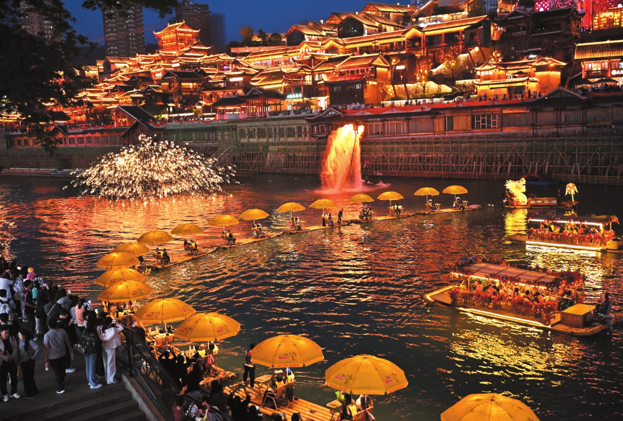 图①为4月4日,湖北省宣恩县城贡水河上进行的火壶和打铁花表演吸引众多游客观赏。新华社发(宋文 摄)