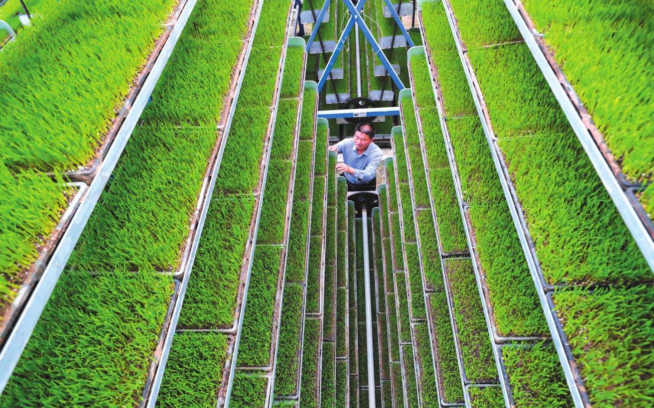 4月6日,在河南省信阳市光山县青龙河合作社全自动智能化育秧工厂,工作人员在管护水稻秧苗。
