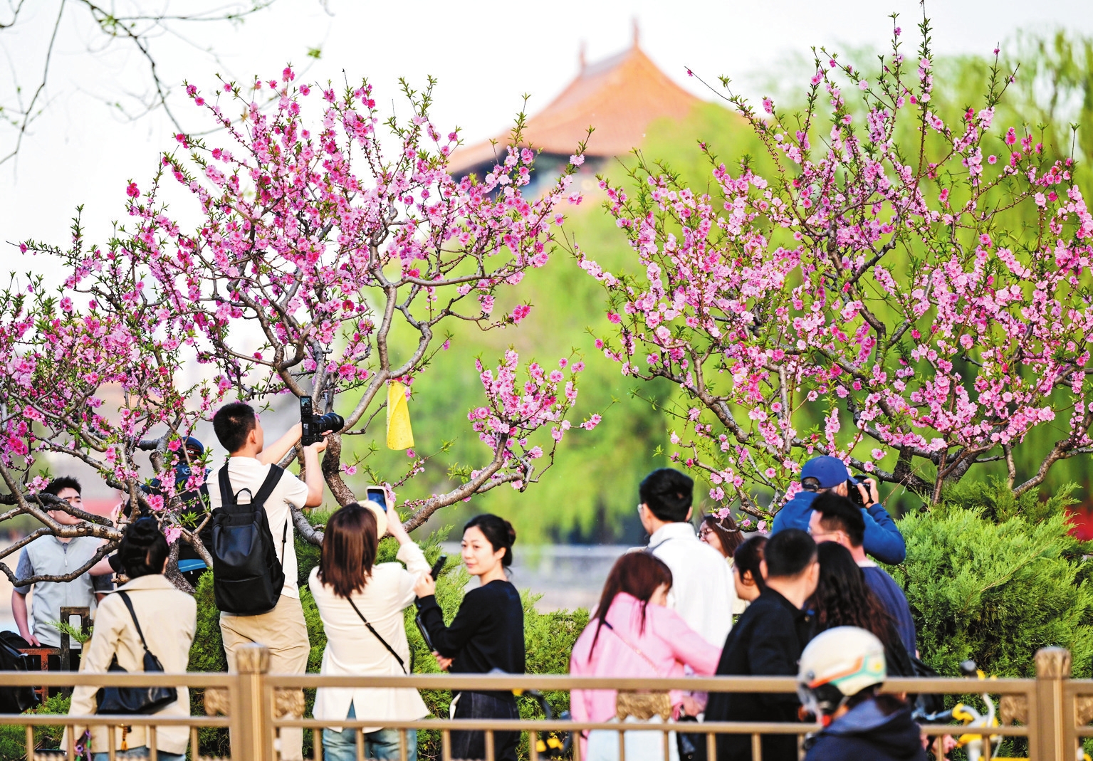 时下,各地春花烂漫,人们纷纷走出家门赏花游园,尽情享受美好春光。图为4月11日,游人在北京故宫西北角楼附近拍照。
