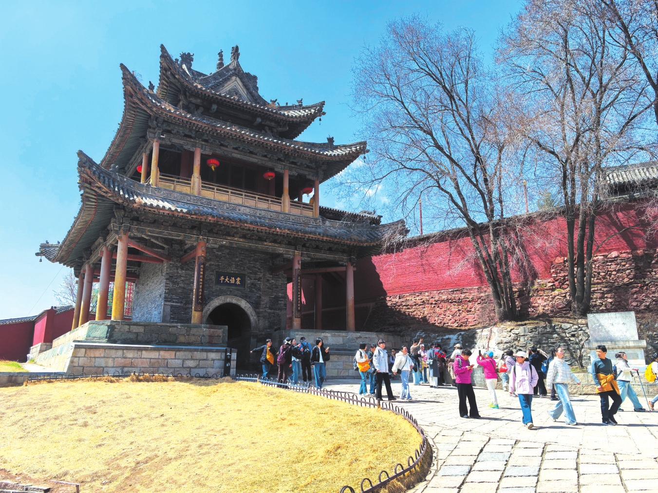 4月14日,五台山显通寺钟楼前游客络绎不绝。史文勇摄
