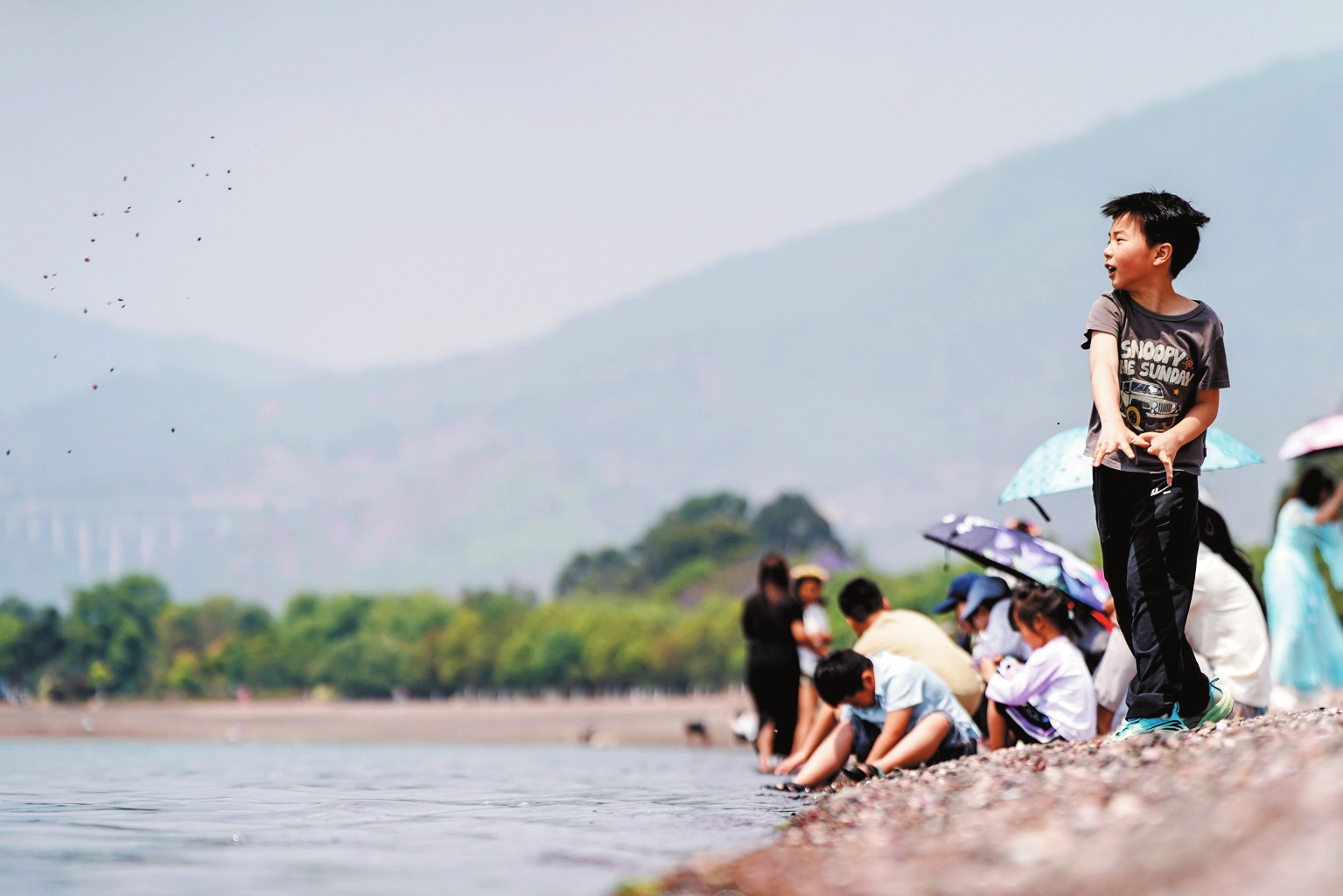 近年来,当地全面推进从“湖泊之治”向“流域之治”的跨越,抚仙湖水质稳定保持优良水平,成为游客心中向往的“诗与远方”。图为4月18日,游客在抚仙湖畔游玩。