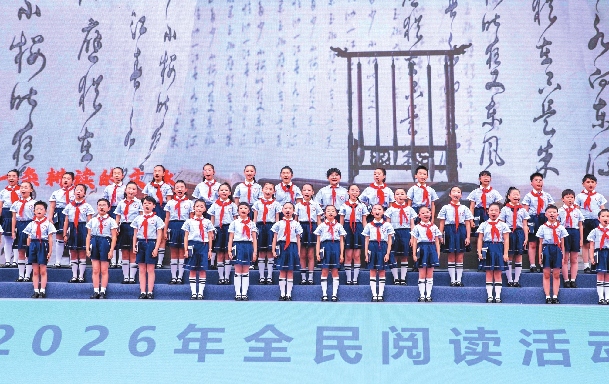 4月21日,学生在江苏省泰兴市新时代文明实践中心广场表演童声合唱《书香里的中国》。在第三十一个世界读书日即将到来之际,各地举行形式多样的阅读活动,让人们徜徉书海、浸润书香。新华社发(顾继红摄)