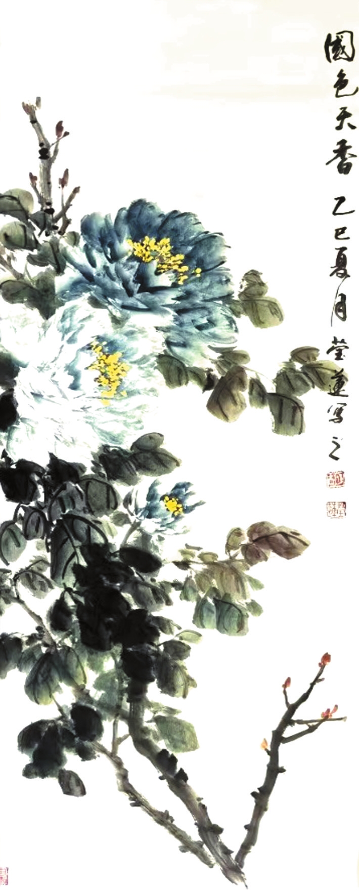 胡莹莲的笔墨并非刻意炫技,而是循着“应物象形”之理自然生发:牡丹花瓣以淡彩层层晕染,辅以墨线勾勒轮廓,既显牡丹的华贵之姿,亦存笔墨的清劲骨力;紫藤枝条以侧锋挥扫而出,既有“折钗股”般的圆劲质感,亦见藤蔓的灵动意趣。恰如北宋画家郭熙在《林泉高致》中所言的“笔补造化”,胡莹莲以笔墨为媒介,贯通物象的自然本真与人文意蕴。