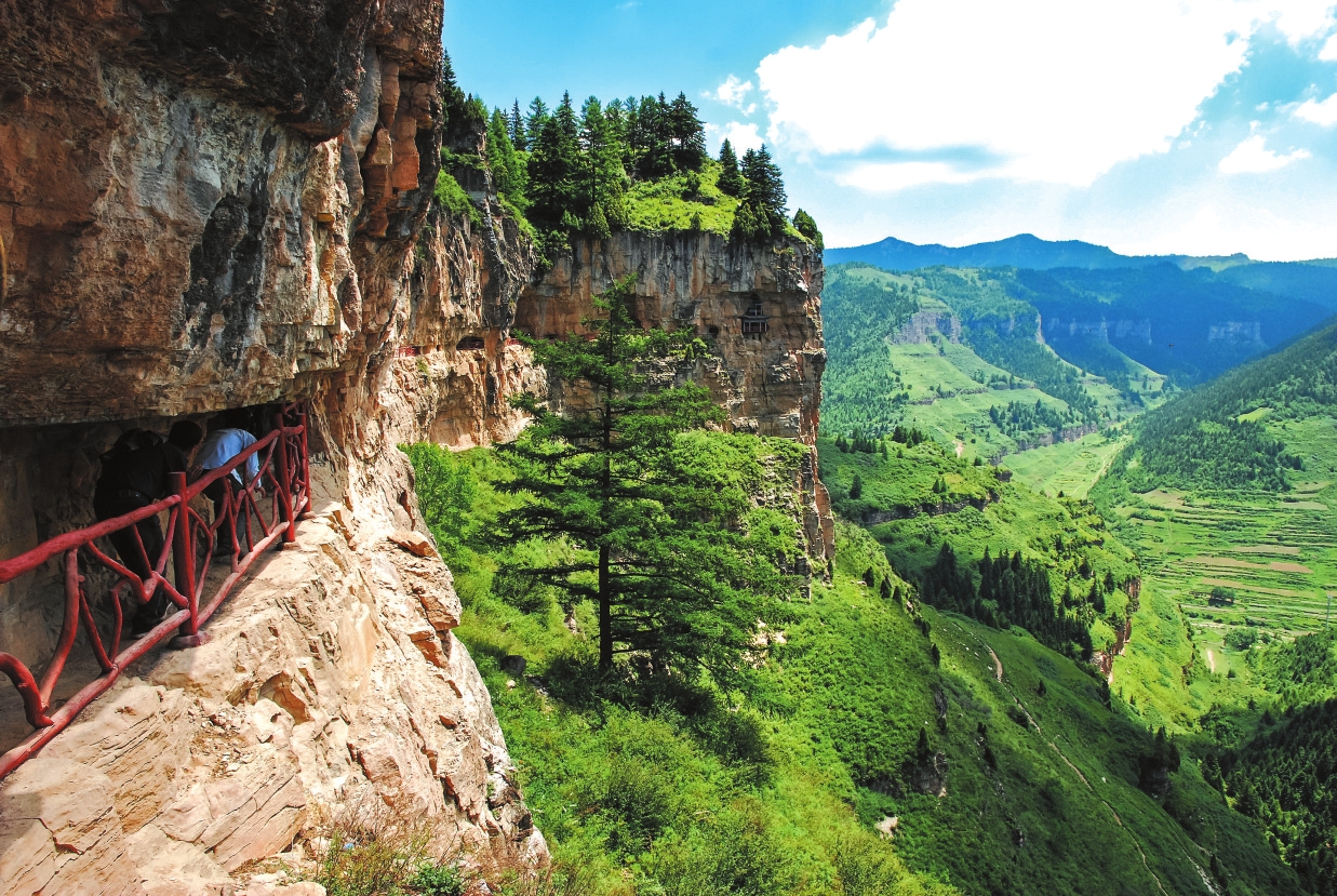 悬崖栈道位于宁武县清真山,属额状丹霞岩地貌,由唐代贞元年间始建的佛教悬空古刹群与栈道共同构成。栈道原长42华里,现有修复段5华里及罗汉殿、毗卢殿等建筑群,其中罗汉殿“回声阶”属全国五大回声建筑之一。悬崖栈道的攀爬较为艰险,需要两个小时,途中要攀登悬崖、台阶,还要穿越仅可容一人通过的山间隧道。
