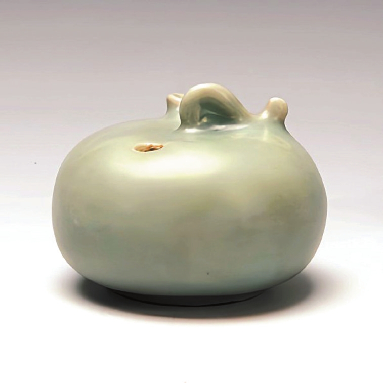 杭州博物馆馆藏的南宋龙泉窑粉青釉柿形瓷水注,宛如一枚刚摘下的青柿,小巧玲珑,一掌可握。这件器物高4.6厘米,口径6.2厘米,底径3.8厘米,中空扁圆的鼓腹设计,尽显灵动之态。顶部中心微凹,环绕的五片柿叶花纹若隐若现,突破了传统“一尖两弯”的柿蒂纹范式,更添清新意趣。叶片间隙贴饰S形细泥条,构成半圆形困藤钮,精巧别致。肩部一侧设出水短流,另一侧留圆形注水孔,暗藏巧思:使用时先注满水,移至砚台旁以手指堵住注水孔,借负压锁住水流,再根据研墨需求缓缓移开手指控制出水量,实则是利用大气压强差调控水流的精妙设计,在方寸之间实现了功能与美感的完美融合。器物通体施粉青釉,釉面光润细腻,足底处的火石红痕迹,是岁月留下的鲜明印记。其精致的器型与莹润的釉色,尽显文人雅士的清雅审美,既是南宋文房的精品之作,更见证了龙泉窑在青瓷史上的美学巅峰。