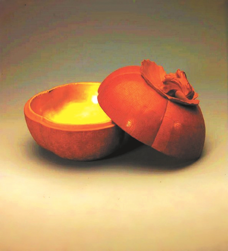 故宫博物院珍藏的清代中期柿形文竹金漆盒,同样堪称仿生文玩的典范。这件器物以黄杨木为胎——这种产自南方的珍贵木料,生长百年直径仅能加粗一尺,木质柔韧细密,色泽淡黄无瑕,细腻润泽堪比象牙。苏东坡曾为其赋诗:“园中草木春无数,只有黄杨厄闰年”,李渔更赞其有君子之风,誉之为“木中君子”。整器雕作柿子形态,通体镶嵌竹黄,表面刻饰精细锦纹,从中部一分为二,以子母口扣合,内壁鎏金,尽显华贵。盖钮雕刻成逼真的柿蒂状,与竹黄的色泽质地相得益彰,观之令人心生欢喜。清中期的宫廷盛行文竹仿生器具,这类器物虽保留实用功能,更多时候却作为陈设品点缀于宫室几案格架之间。这件柿形盒便是其中的佼佼者,既凝聚了匠人的巧思与精湛技艺,更彰显了当时宫廷生活的精致格调。