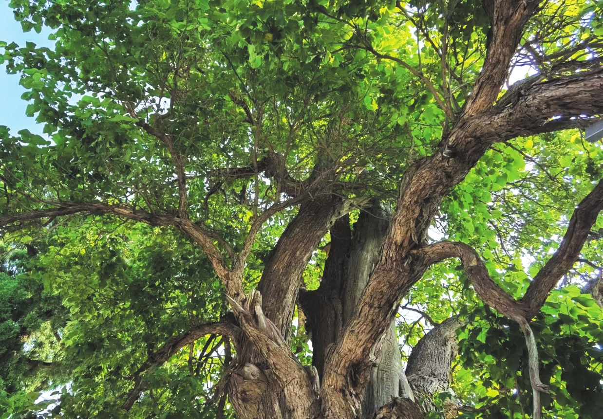 柏枝寺的古代水利系统是为一绝,但最震撼人心的却是这里的树。这座寺院里共有四棵古树,两柏两楸树,柏树栽在大殿前方的两侧,楸树植于庙院南北两个角上。这四棵老树树高均在20米开外。听当地百姓讲,有专家测过,四棵树的树龄应在1500年以上,实乃三晋罕有之宝。柏树笔挺入云,枝叶繁茂,树干粗壮两人勉强合抱。两棵楸树姿态近似,生长奇伟令人称叹。靠北那株楸树尤为粗壮,9个成年人才能搂抱住。其树根突出地表,显现出瘤状,树身自底部裂为多杈,各自冲天而长,因而在中间形成一个阔大空间,能容三四人围坐。楸树顶部虽有枝条枯萎,但依然苍翠遮荫,被誉为“华夏第一楸”,2018年获评“中国最美古树”。