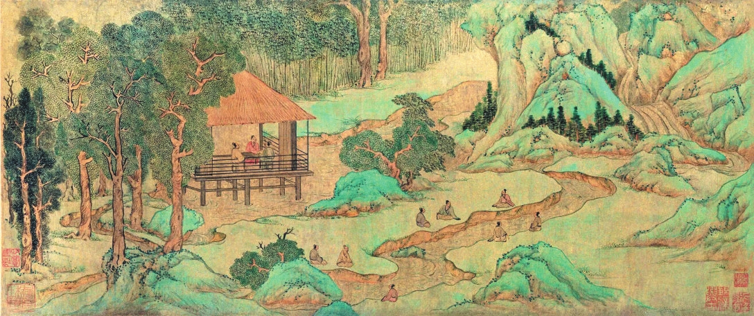 与陂渚、江河、竹林、枯石相结合,增加了亭子的社交礼仪、宴饮游赏功能,自此亭子开始成为中国文人与雅集文化的建筑符号。由文人、画师参与的园林,主要是为了放松身心而建,此时的亭子建筑多有风雅之意,供文人士大夫游赏赋诗之用。白居易《闲居自题》诗中云:“波闲戏鱼鳖,风静下鸥鹭。寂无城市喧,渺有江湖趣。”在他的洛阳履道里别业,修建了中岛亭、琴亭,还有乐童于中岛亭中奏乐,极尽风雅。