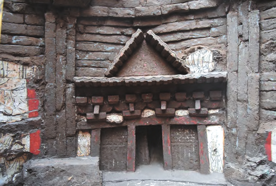 该墓葬为仿木构砖雕壁画墓,墓葬坐北朝南,由墓道、甬道和墓室三部分组成。墓葬装饰采用砖雕和彩绘相结合手法。