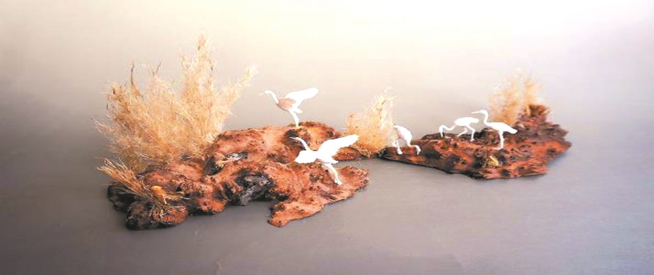 这些温暖的记忆,催生了笔者创作《东滩见白鹭》的灵感。挑选随形麻梨木作底板,木材纹理镌刻着岁月奥秘;再购入3D打印的白鹭模型,形态逼真;最后采摘蝴蝶湾的芦花与干草作配饰,为作品注入沧桑韵味。