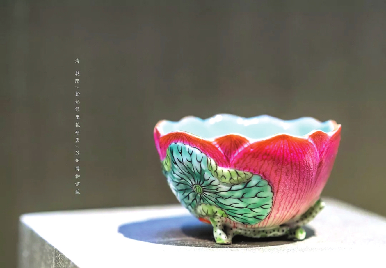 相比之下,仿生瓷则源于对自然的崇尚,以丰富的造型模拟自然物象,取材生动,花草蔬果、鸟兽虫鱼,以至木石纹理皆可入瓷。它们或泼辣清新,或简练朴素,既展现了工匠高超的塑形技艺,更传递着“天人合一”的造物思想以及追求野趣、崇尚自由、返璞归真的人生境界。如元龙泉窑荷叶盖罐、万历青花梵文莲瓣盘、乾隆粉彩绿里花形杯、道光木纹釉花盆等,都是平时难得一见的馆藏仿生瓷器。