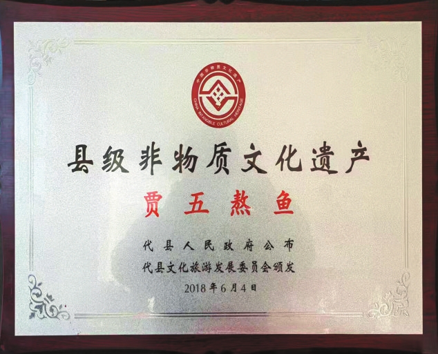 玲玲招呼着我对新店进行了参观。这个新开的熬鱼店就建在旧店的东边,总占地面积约五千平方米。开放、透明的配菜、烹饪车间内,设备先进,一应俱全。在玲玲的盛情邀请下,我有幸进入熬鱼主制间参观了熬鱼的简要制作过程。师傅们先把已经加工处理干净的活鱼周身裹满淀粉,放入滚烫的油锅中炸至金黄捞出备用,再把足量的花椒、大料,油炸至焦糊也捞出来,用纯炭火把直径约0.8米的大铁锅烧热后放入猪油滚开。葱、姜、蒜、辣椒及油炸后的花椒、大料连同整条鱼加适量水一齐入锅,略等片刻浇上山西老陈醋,加入白糖、茴香、味精、盐、韭菜等,盖上特制的锅盖猛火熬制约半个小时,再把老汤取出少许进行勾芡,就大体完成了整个熬鱼的制作过程。“贾五熬鱼”被山西省烹饪餐饮协会评为“中国特色晋菜”;被代县人民政府、县文旅局评为“县级非物质文化遗产”,堪称“当今美食,人间至味”。