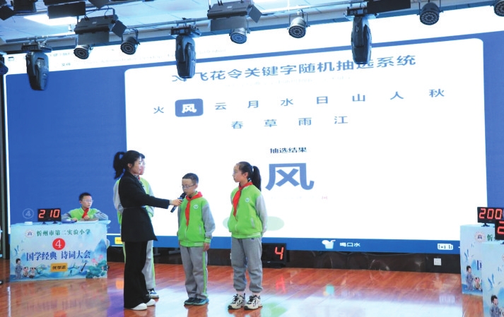 本报讯 古韵悠悠,浸润千年文脉;童声朗朗,传唱经典诗篇。为进一步弘扬中华优秀传统文化,提升学生文化素养,近日,忻州市第二实验小学举行校园诗词大赛。比赛设置小试牛刀“背诗词”、珠联璧合“接诗句”、拨云见日“辨诗意”、巅峰对决“飞花令”等多个环节。选手们诗词功底扎实深厚,将激烈的比赛转化成了一场诗词的交流盛宴。